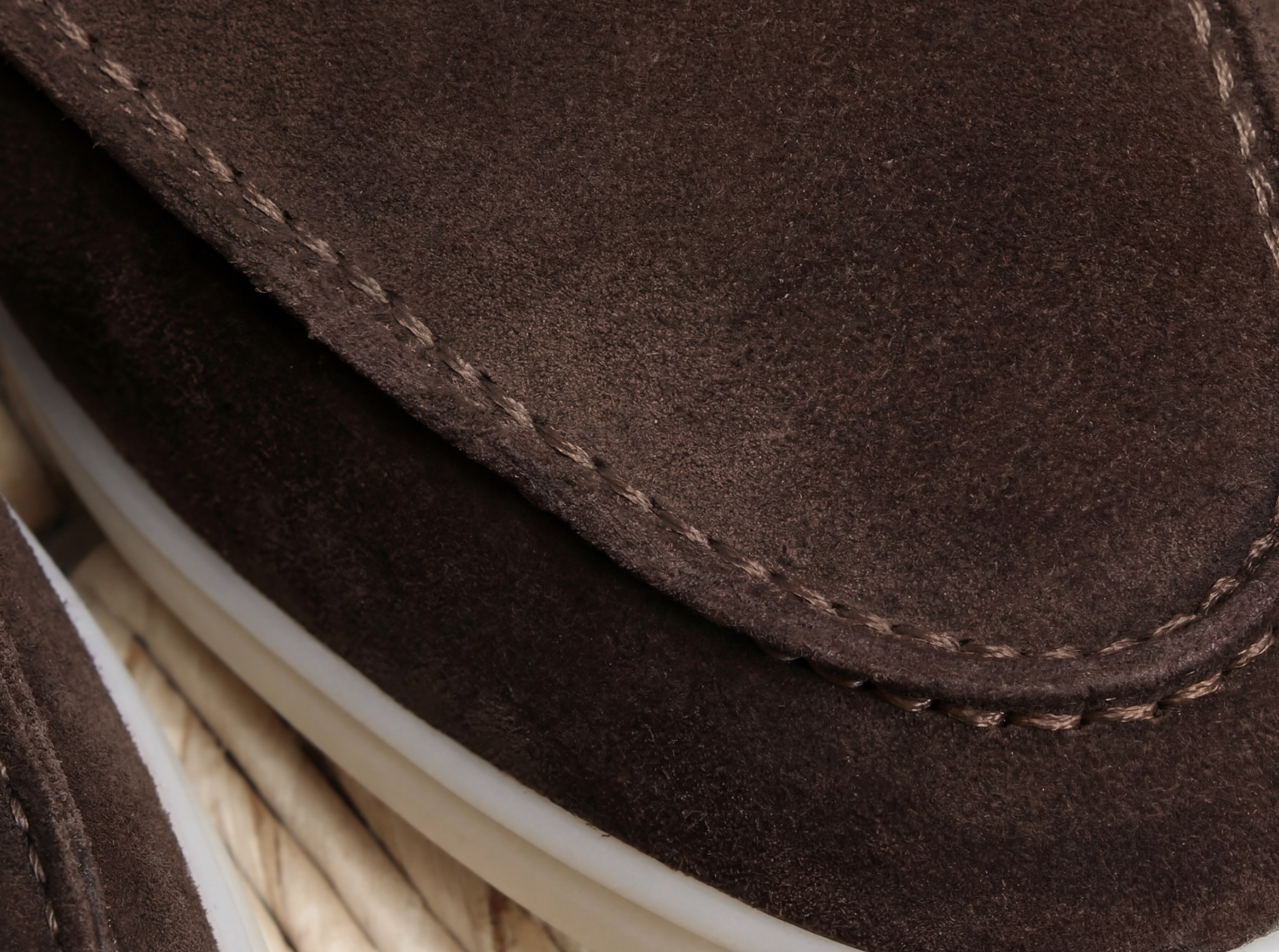 Delicate to the touch, quietly robust in wear. Calf suede with a deep, matte richness, crafted to soften and refine with every step.