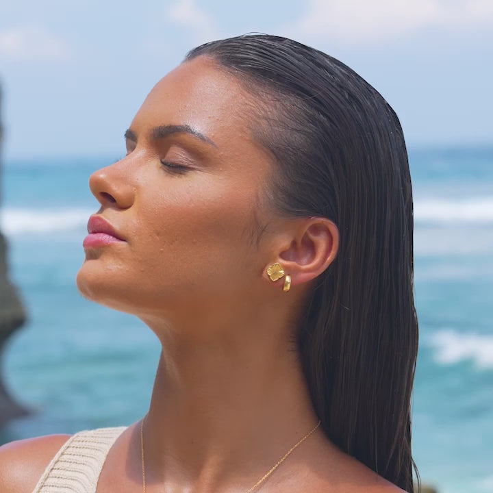 Schatten van de oceaan, tijdloze elegantie. Een subtiel statement: deze sierlijke gouden klaveroorbellen zijn geïnspireerd op de natuurlijke schoonheid van de zee. Combineer ze met elkaar om je eigen signatuur te creëren, of met de Amaya Sunlight-armband voor een complete look.