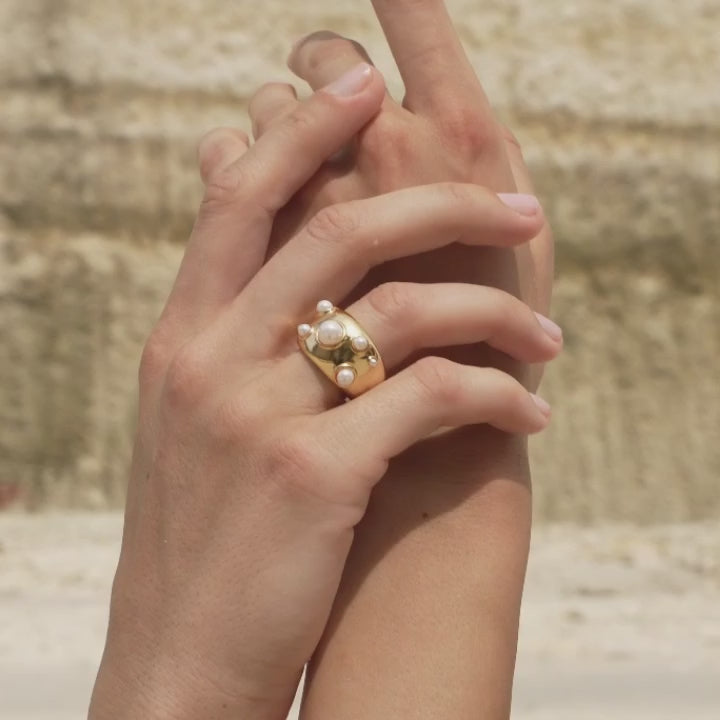 De elegantie van de oceaan, aan je hand. Het gepolijste koepelvormige silhouet van deze ring, bezet met iriserende glazen parels, voegt een vleugje kustcharme toe aan elke outfit. Draag Ondine voor een vleugje verfijnde elegantie of combineer met andere ringen om je eigen signatuur te creëren, in een superglanzende gouden of zilveren plating.