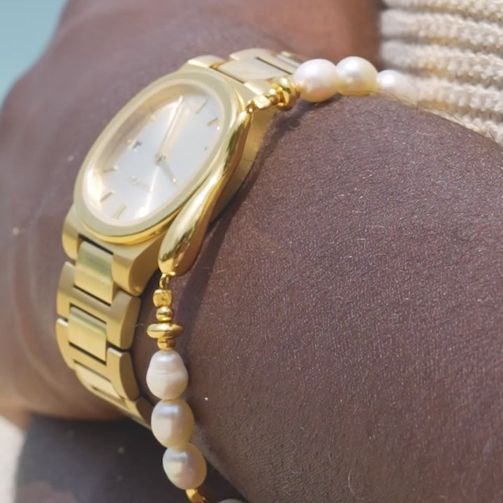 Schatten van de oceaan, tijdloze elegantie. Delicate parels aan een ketting met een gouden sierdetail. Deze armband is geïnspireerd op de natuurlijke schoonheid van de zee. Draag hem solo voor een vleugje verfijnde elegantie of combineer hem met andere armbanden om je eigen, kenmerkende stijl te creëren.